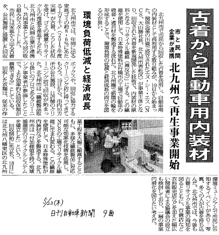 2014/05/22 古着から自動車用内装材/環境負荷低減と経済成長(日刊自動車新聞)