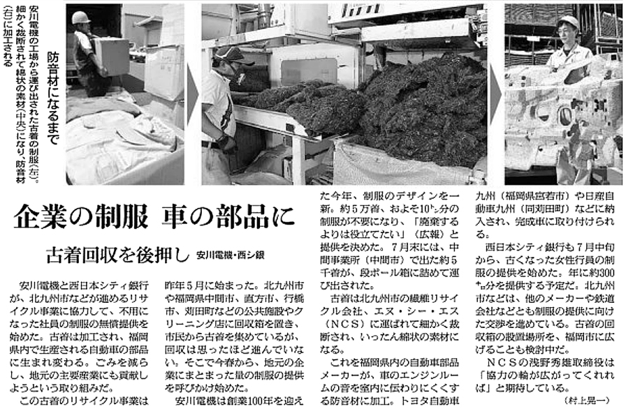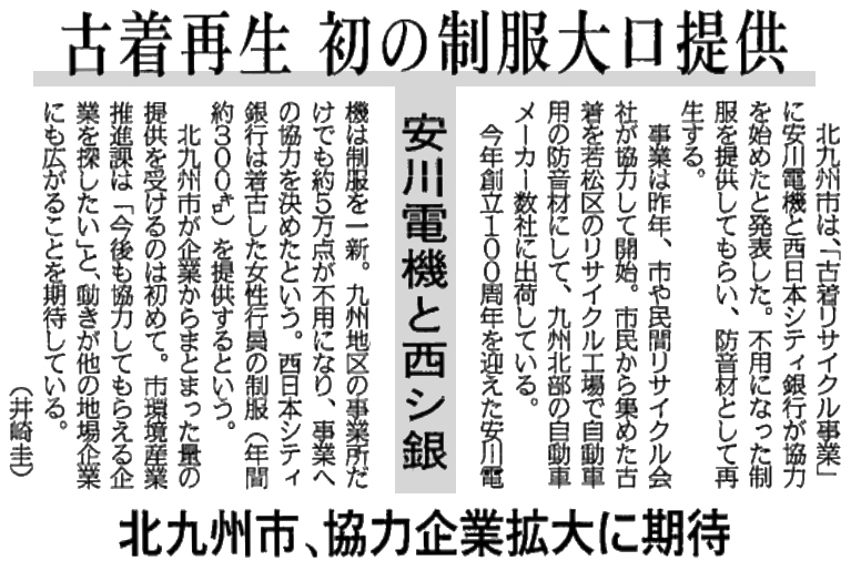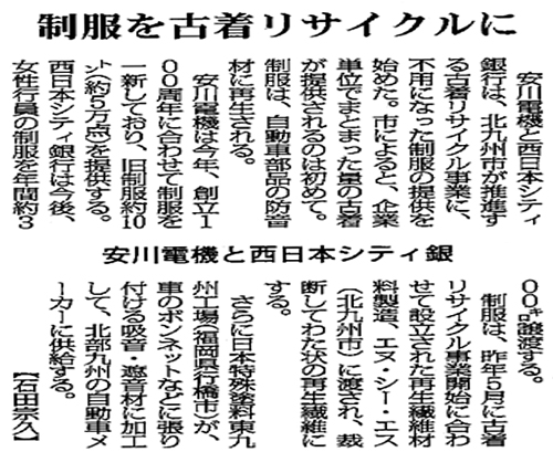 2015/07/22 制服を古着リサイクルに/安川電機と西日本シティ銀(毎日新聞)