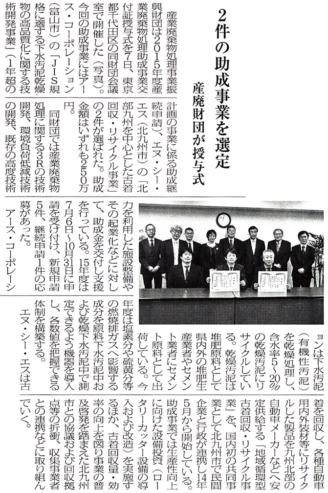 - 「平成27年度 産業廃棄物処理助成事業」に採択(環境新聞)