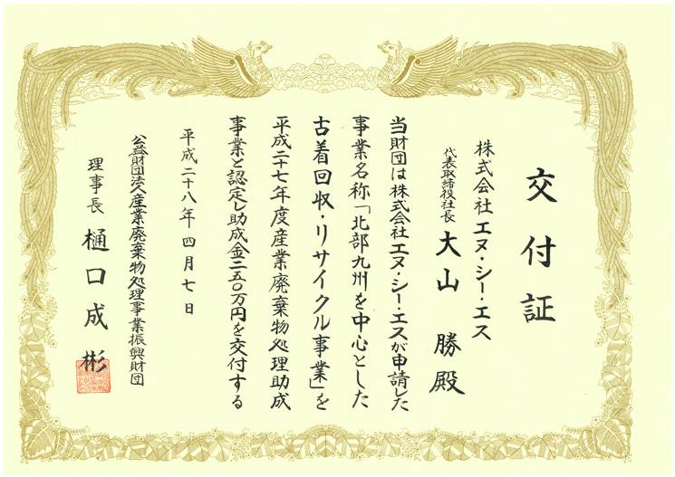 公益財団法人 産業廃棄物処理事業振興財団 「平成27年度 産業廃棄物処理助成事業」に採択されました。 |